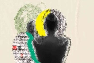 Abstract art, collage with female portrait and mountains, generative ai