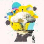 Abstract art, collage with female portrait and mountains, generative ai